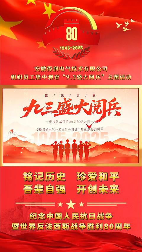 2025年9月3日上午9點,為紀念中國人民抗日戰(zhàn)爭暨世界反法西斯戰(zhàn)爭勝利80周年,北京天安門舉行了隆重的紀念大會和閱兵儀式。得潤電氣黨支部號召組織公司全體員工在一號車間集體觀看了這場震撼人心的直播盛況。